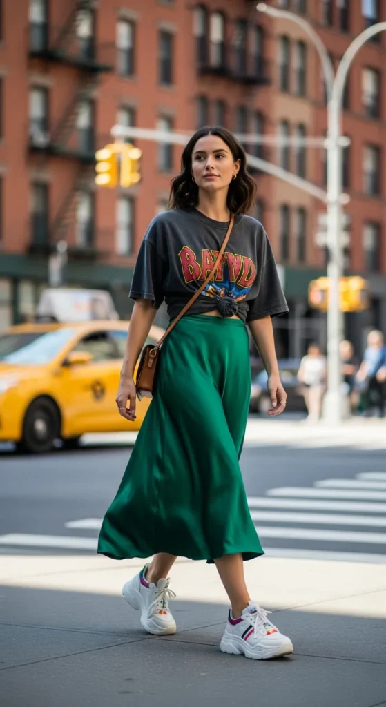 Mixing a relaxed graphic tee with a silky midi skirt creates an effortlessly flirty contrast. The casual top tones down the elegance, making the outfit feel approachable and stylish.