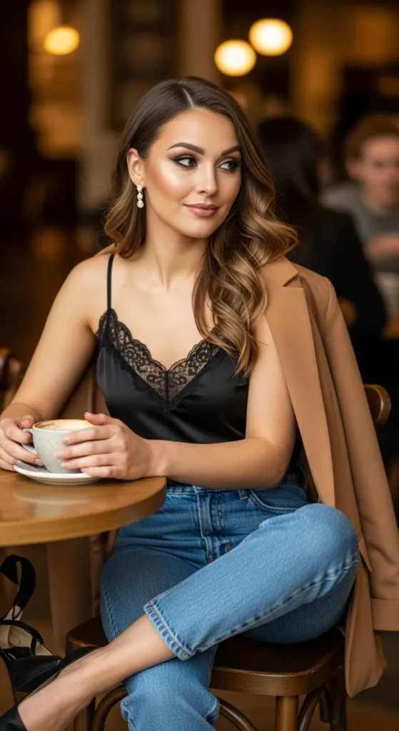 A delicate lace camisole paired with classic straight-leg jeans strikes the perfect balance between soft and structured. It’s simple but undeniably attractive.