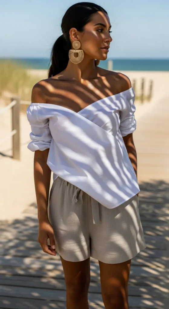 An off-shoulder top instantly adds flirtation, especially when paired with relaxed linen shorts. The exposed neckline and airy fabric create a breezy, sun-kissed look ideal for summer days.