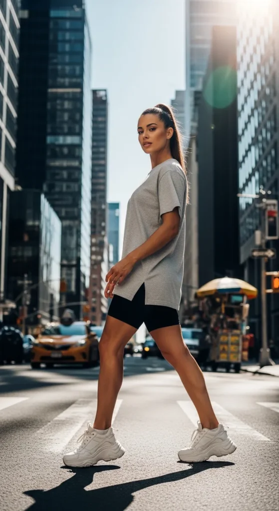 An oversized button-down shirt paired with fitted biker shorts creates a bold yet relaxed contrast. It’s modern, confident, and perfect for casual days.