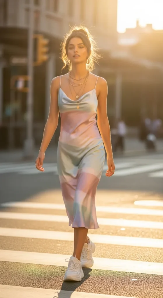 A silky satin slip dress in a soft pastel shade paired with chunky white sneakers creates a playful balance between elegance and street style. The fluid fabric moves beautifully, giving an easy, flirtatious energy perfect for warm afternoons.
