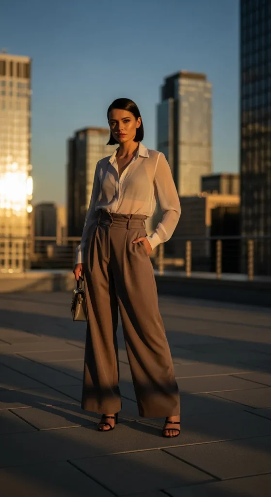 A lightweight sheer blouse layered over a simple bralette with flowy wide-leg pants creates a subtle yet confident look. It plays with texture and transparency in a tasteful, modern way.