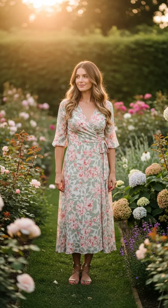 A wrap dress hugs the body in all the right places while allowing movement. Paired with minimal strappy sandals, this look feels naturally flirty and universally flattering.