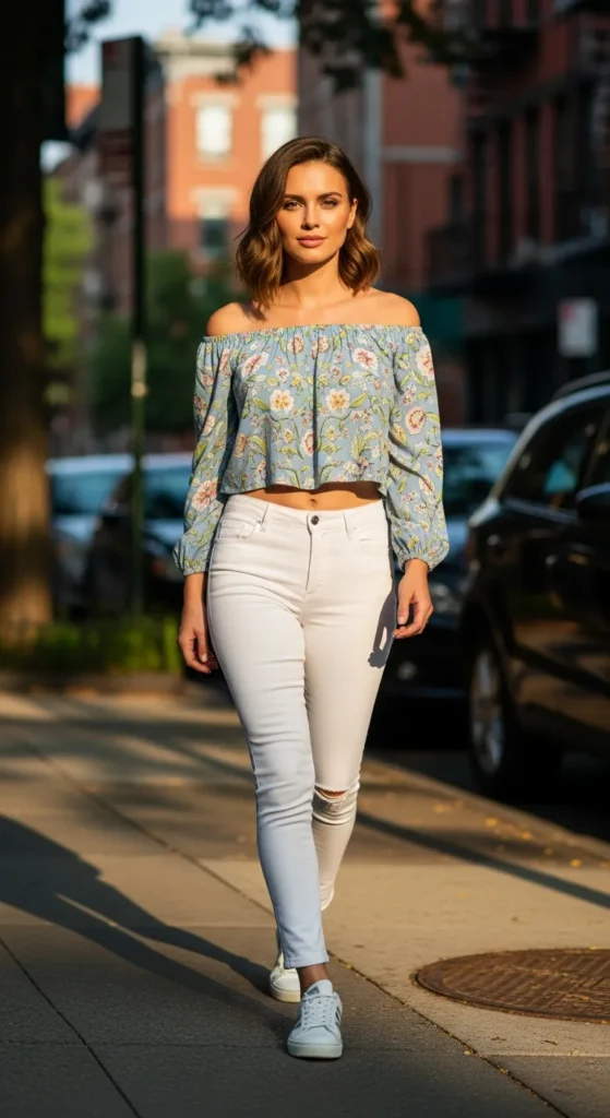 A baby blue off-shoulder floral crop top paired with crisp white jeans creates a fresh, clean summer look. The cropped top adds youthfulness, while white jeans keep it chic.