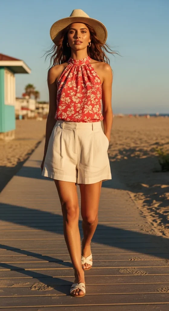 A coral halter neck floral top paired with cream linen shorts exudes a sun-soaked vacation vibe. The halter neck highlights the shoulders, adding effortless summer elegance.
