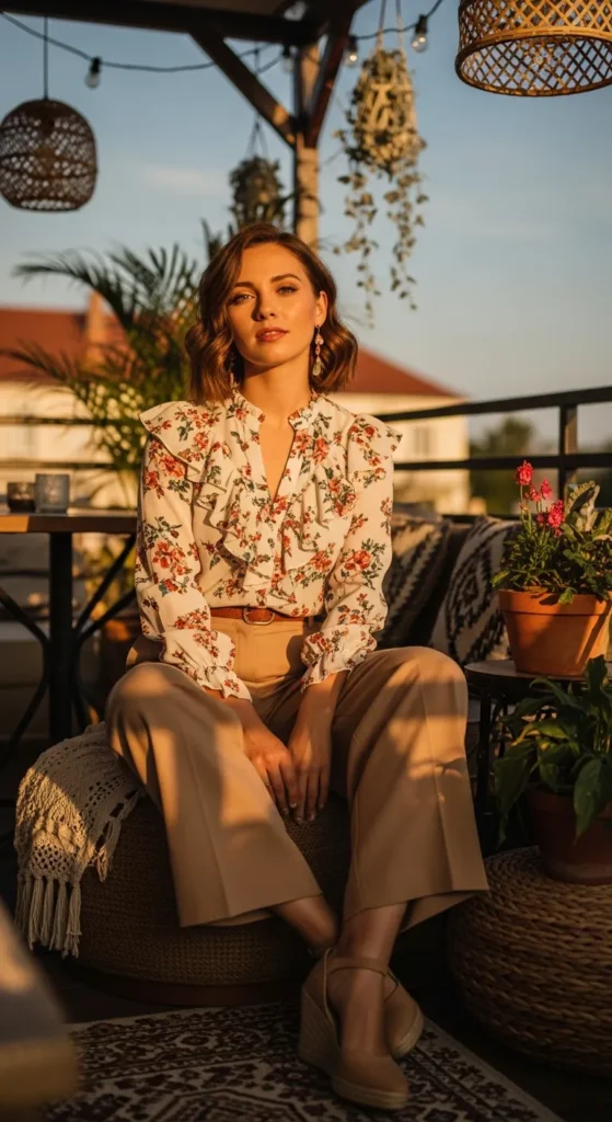 A cream ruffle floral blouse paired with tan wide-leg pants creates a boho-chic summer look. The ruffles bring movement, while the wide-leg pants add sophistication and comfort.