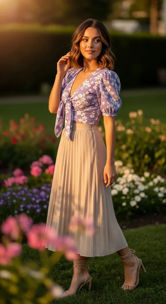 A lavender tie-front floral top with a neutral pleated skirt creates a dreamy, feminine look perfect for a garden date or brunch. The tie-front detail adds playful charm.