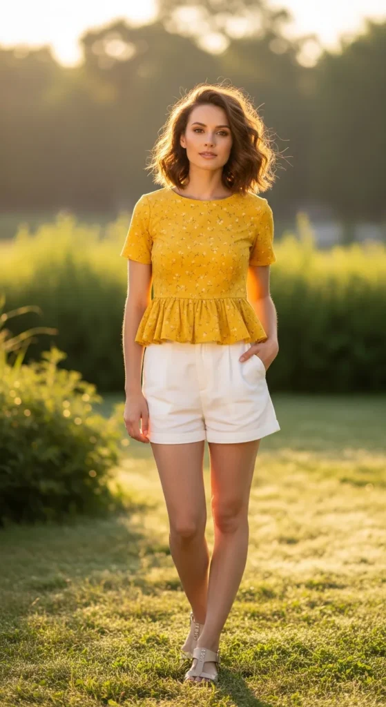 A soft yellow peplum floral top paired with crisp white high-waist shorts creates a playful, sun-kissed summer vibe. The flowy top balances the structured shorts for a relaxed yet put-together look.