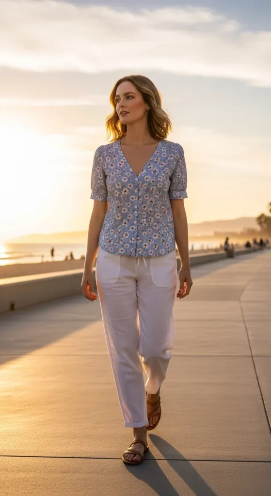 A light blue buttoned floral top with white linen pants feels crisp and fresh. The relaxed fit balances the structured pants, ideal for casual summer evenings.