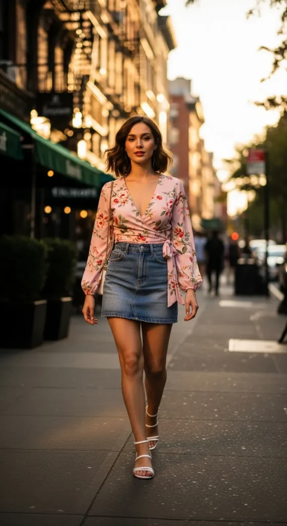 A pastel pink wrap floral blouse tucked into a light-wash denim skirt gives a romantic, feminine feel. The wrap accentuates the waist while the skirt adds a casual, easy-going vibe.