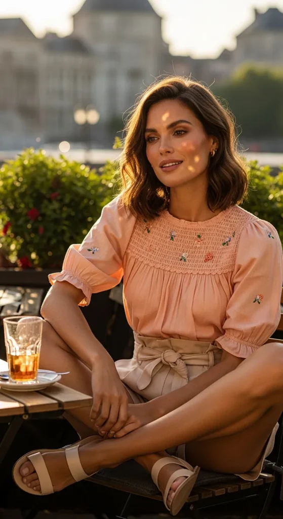 A peach-smoked floral top with paperbag waist shorts combines texture and structure. The smocking hugs the torso while the shorts create a relaxed yet tailored silhouette.