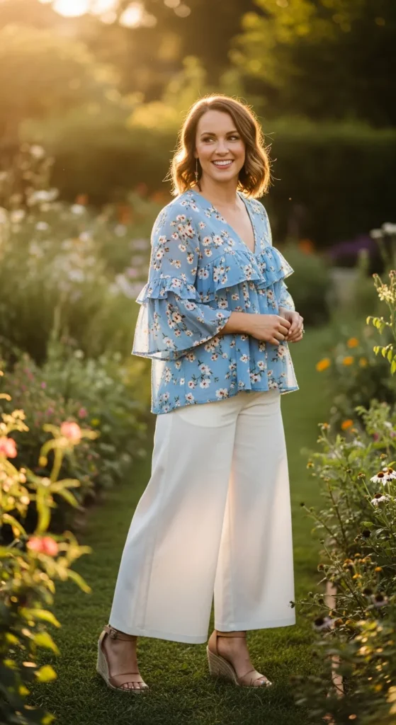A sky-blue ruffled floral top tucked into white palazzo pants offers a breezy, romantic silhouette. The ruffles add movement while the wide-leg pants keep the outfit airy and comfortable.