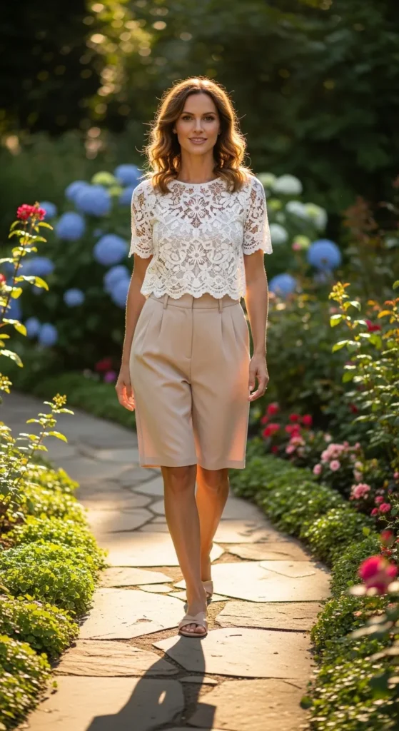 A white lace floral top with soft beige shorts offers a delicate, ethereal summer look. The lace details enhance femininity, while beige shorts keep it casual and comfortable.