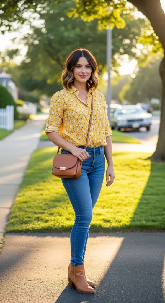 A bright yellow button-up floral shirt with classic skinny jeans creates a cheerful, everyday outfit. Roll up the sleeves for a casual vibe while keeping the floral print fresh and fun.