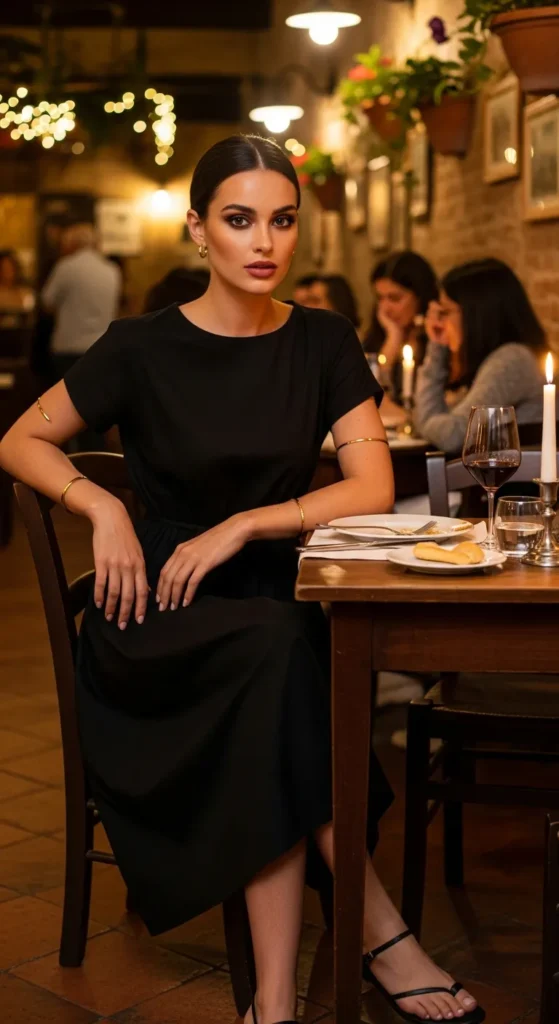 A simple black cotton midi dress feels powerful yet understated, perfect for evening dinners in Florence.