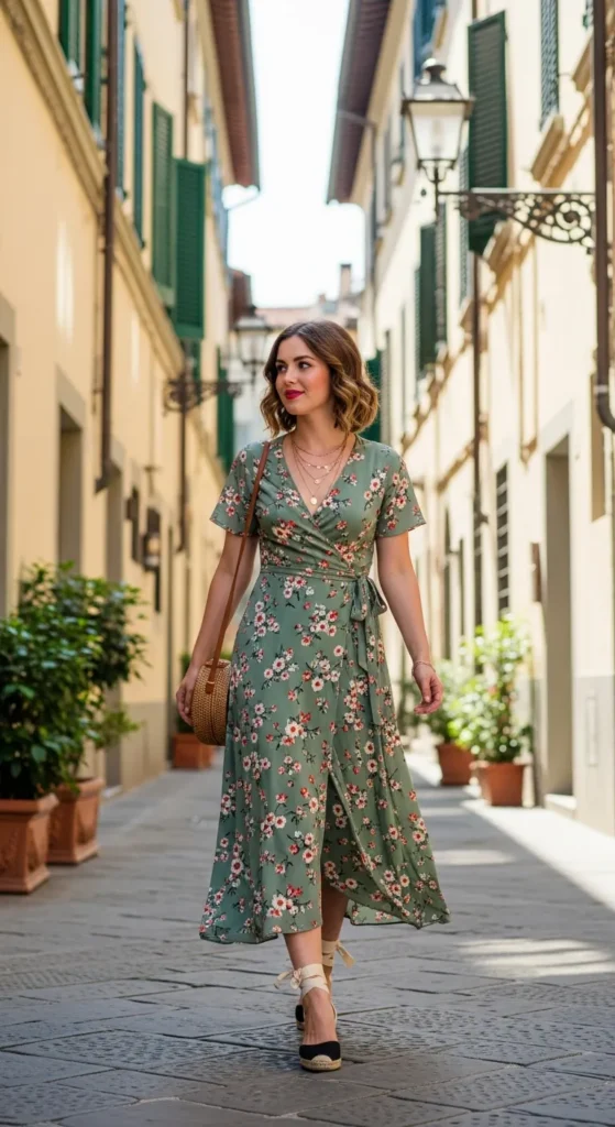 A soft floral wrap dress in muted blush or sage feels romantic without being overly bold. It moves beautifully as you wander narrow streets and feels light in the summer heat.