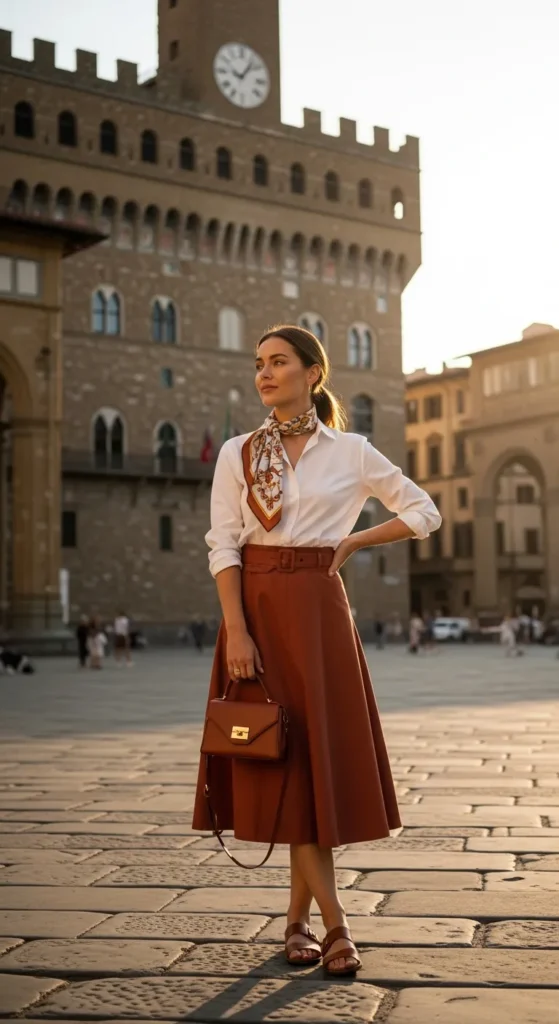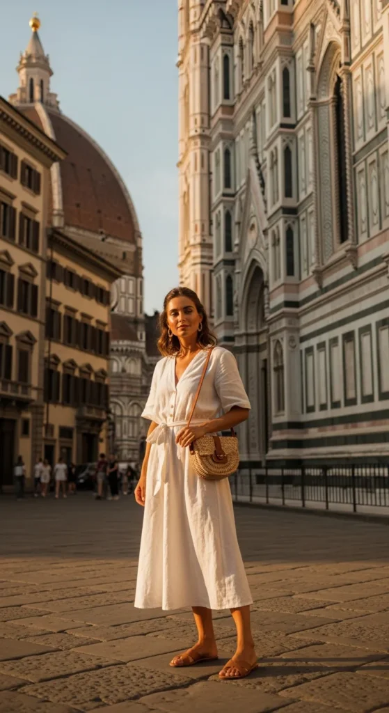 Stylist Suggestion: Pair this with tan leather flat sandals and delicate gold hoop earrings. The natural tones echo Florence’s warm architecture, and flat sandals keep you comfortable on cobblestones without sacrificing elegance.