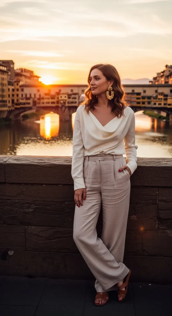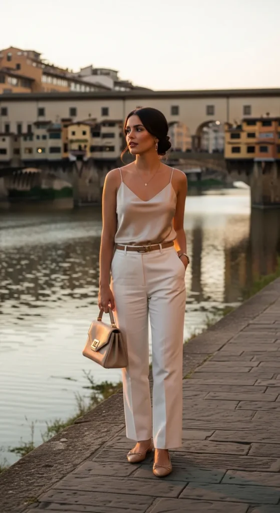 High-waisted cream wide-leg trousers paired with a champagne silk camisole create a refined yet breathable look perfect for museum mornings and terrace dinners along the Arno.