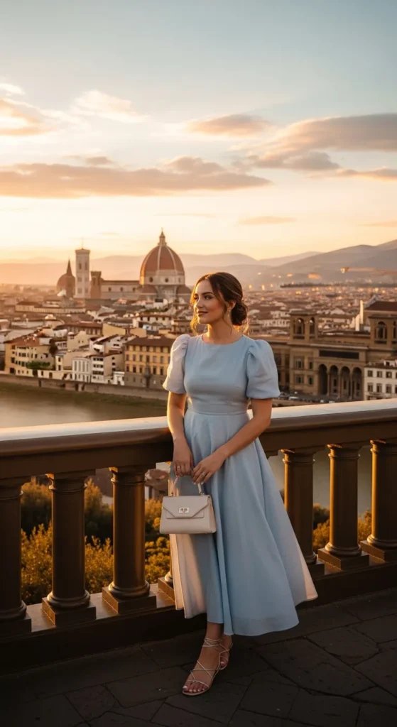 A soft pastel puff-sleeve midi dress feels dreamy against Florence’s Renaissance backdrop. The feminine silhouette adds subtle drama without being overwhelming.