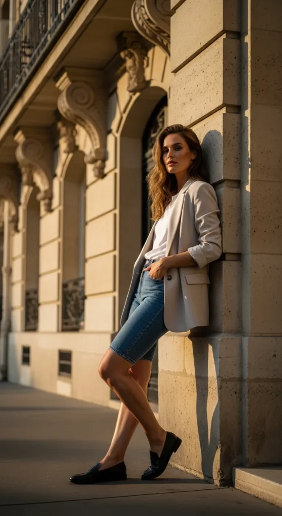 Layering a lightweight blazer over a simple tee and denim shorts adds structure without heaviness. It’s that perfect blend of casual and refined that defines Parisian style.