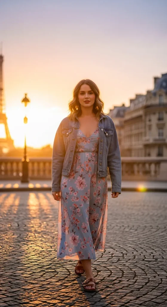 A soft summer dress layered with a light denim jacket adds just enough edge to a feminine base. It’s perfect for transitioning from warm afternoons to cooler evenings.