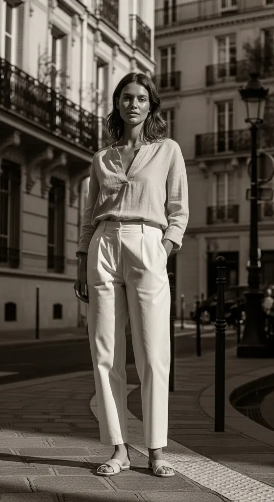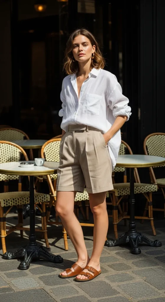 A slightly oversized white linen shirt tucked into tailored high-waisted beige shorts creates that airy, sun-kissed Parisian vibe. It feels light, relaxed, and polished enough for a casual café morning or a slow afternoon walk.