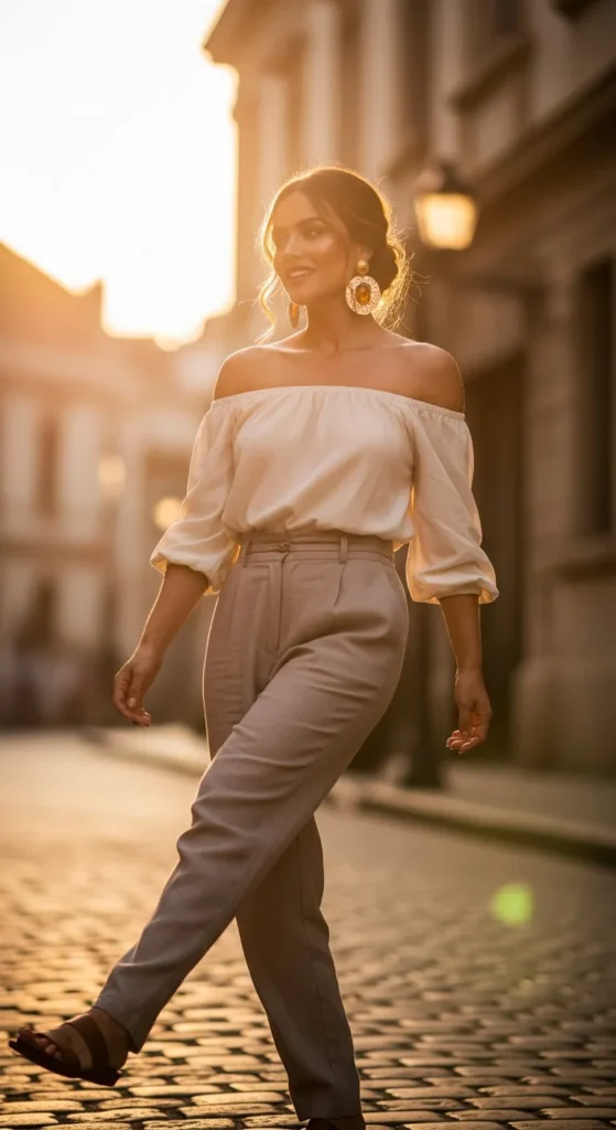 An off-shoulder top paired with relaxed linen pants feels feminine and breezy. It’s perfect for hot days when comfort matters but style still speaks quietly.