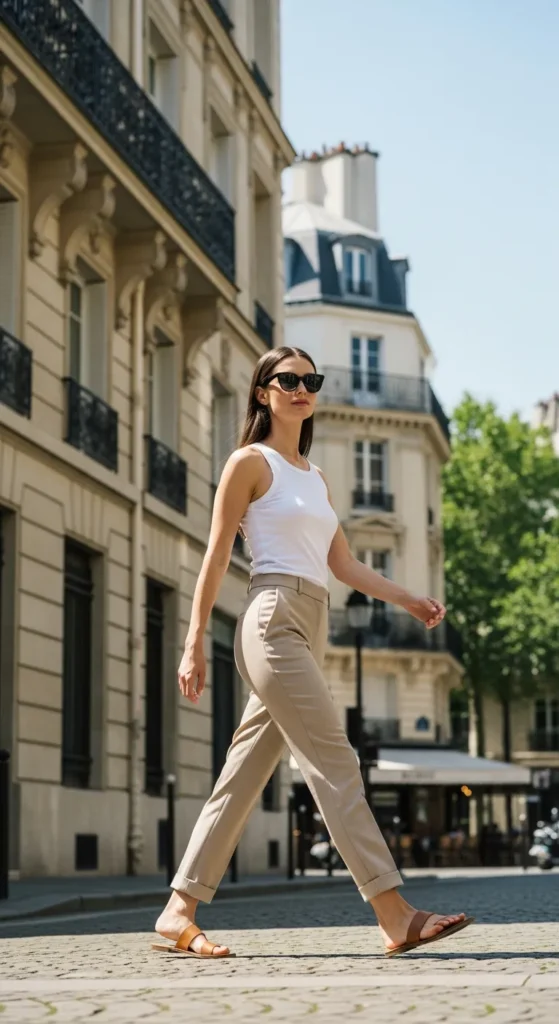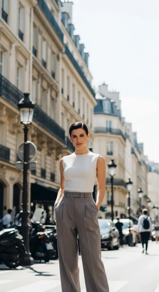A simple fitted tank top tucked into high-waisted tailored trousers creates a clean, modern silhouette. It feels powerful yet relaxed, ideal for warm city days with a hint of sophistication.