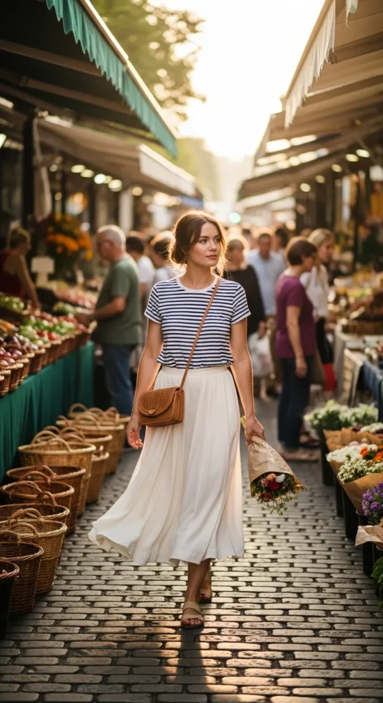A classic striped tee tucked into a flowy neutral midi skirt balances structure with movement. It feels feminine without being overly dressed, perfect for strolling streets or browsing local markets in the heat.
