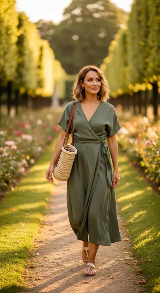 A lightweight wrap dress defines the waist while staying breezy and comfortable. It moves beautifully and feels naturally feminine without being overly styled.