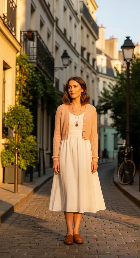 A lightweight cropped cardigan layered over a linen midi dress creates a cozy yet polished French summer outfit. The layering adds dimension while still feeling light for warm days.