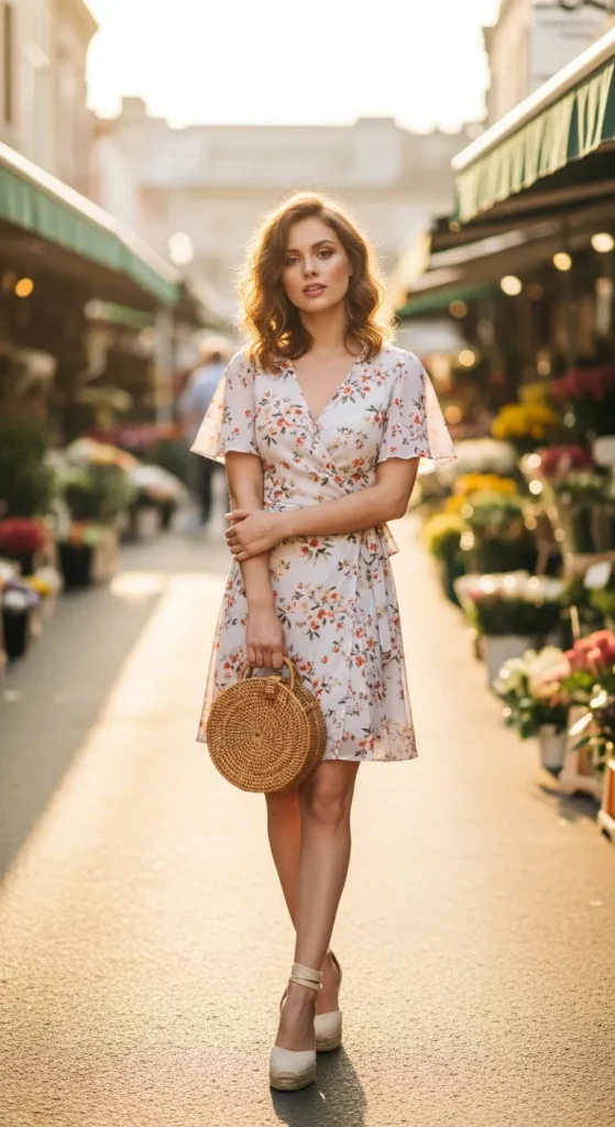 A soft floral wrap dress captures romantic French summer energy perfectly. The wrap silhouette flatters the waist while the flowing fabric moves gracefully, making it ideal for garden lunches or sunny weekend markets.