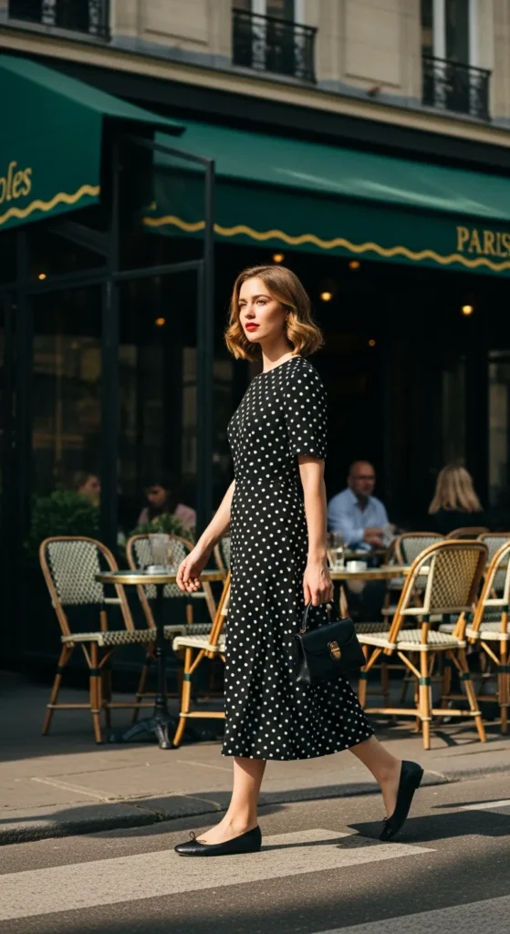 A polka dot midi dress brings playful elegance to French summer fashion. The soft flow of the dress paired with classic dots creates a timeless vintage vibe that feels feminine and easy to wear all day.