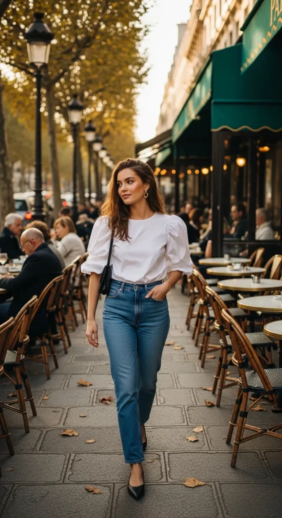 A soft puff sleeve blouse styled with classic straight jeans blends feminine charm with casual comfort. The volume in the sleeves adds subtle drama while denim keeps the outfit grounded.