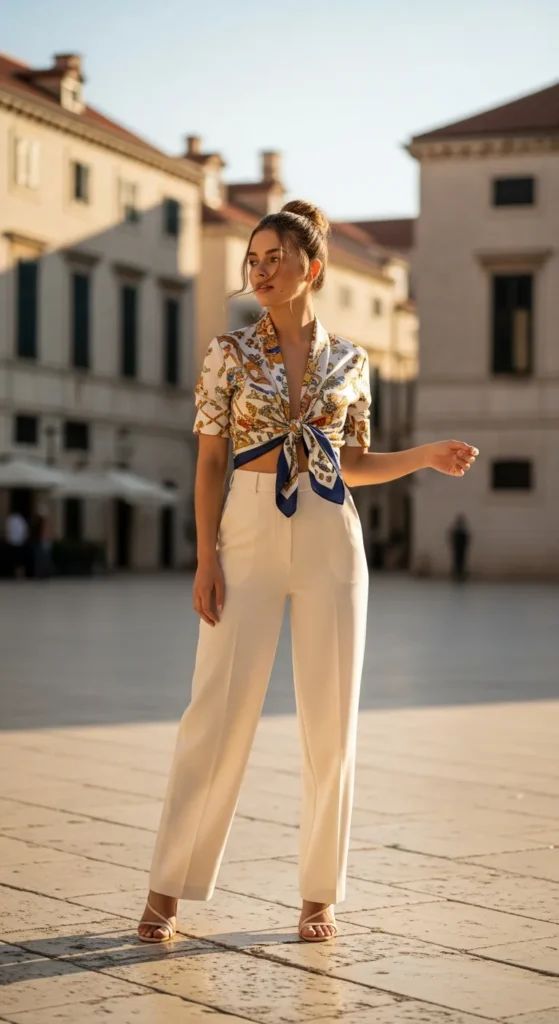 A silk scarf styled as a top paired with wide-leg trousers feels bold yet effortlessly French. The flowing silhouette and luxurious fabric create a breezy summer statement look.