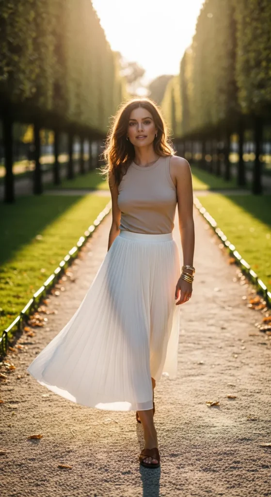 A fitted cotton tank paired with a flowing pleated midi skirt creates an effortlessly elegant outfit. The clean lines of the tank balance the graceful movement of the skirt beautifully.