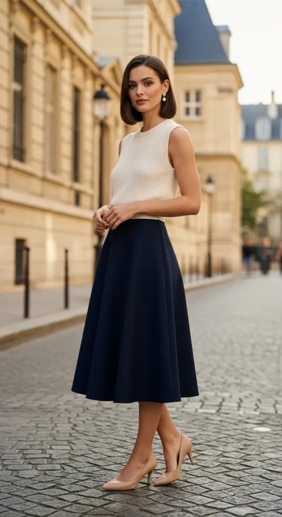 A fitted sleeveless knit top tucked into an A-line skirt creates a polished silhouette that feels classic and modern at the same time. The clean lines give the outfit a graceful French charm.