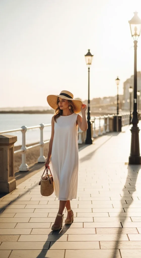 A sleeveless midi dress paired with a wide straw hat creates an effortlessly graceful French summer silhouette. The airy dress moves beautifully in the breeze while the hat adds a timeless vacation feel.