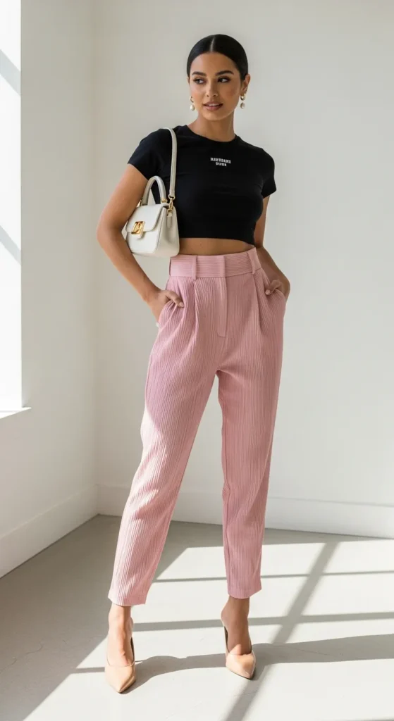 A cropped graphic tee paired with high-waisted plisse trousers in cream, blush, or sky blue creates a surprisingly chic outfit that works for lunch dates and gallery visits alike. The pleated texture of the fabric adds a quiet elegance that balances the casual tee.