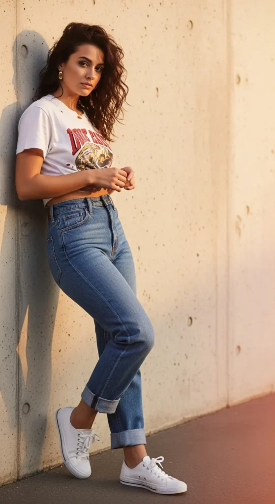 This is the combination that works every single time without fail. A slightly cropped graphic tee with high-waisted straight-leg jeans in a medium blue wash hits that classic sweet spot between comfort and cool.