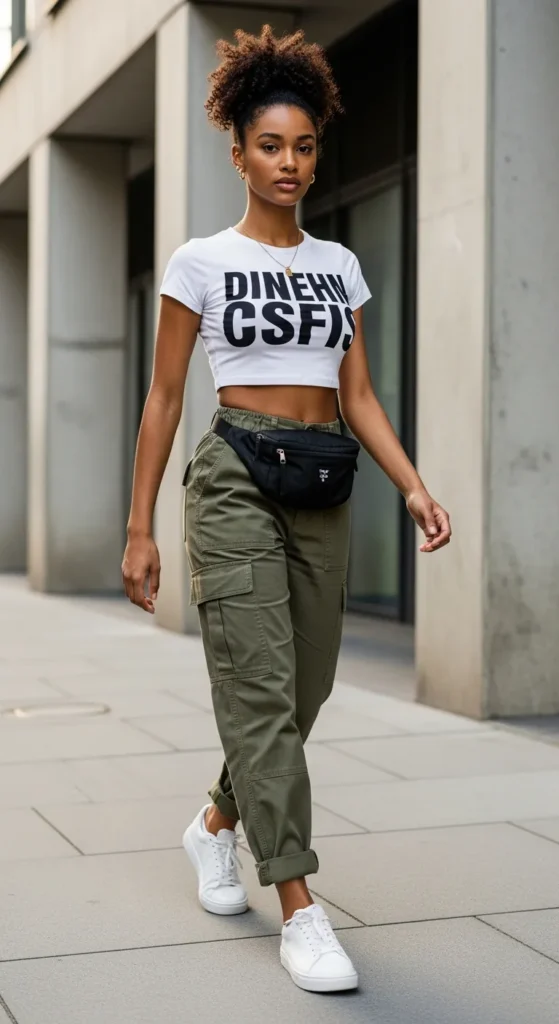 A cropped graphic tee with relaxed cargo pants in khaki or olive creates that utility-meets-street-style combination that has been having a real moment. Add a small belt bag to the waist for both function and fashion.