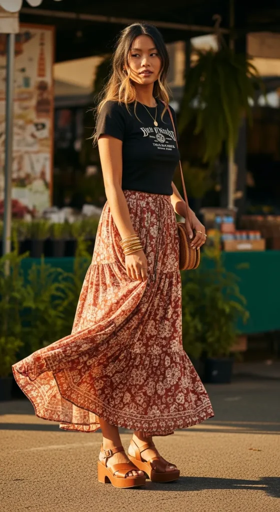 A fitted graphic tee paired with a tiered boho skirt in a warm floral or earthy print creates an interesting contrast between graphic attitude and feminine flow. It is the kind of outfit that surprises people in the best possible way.