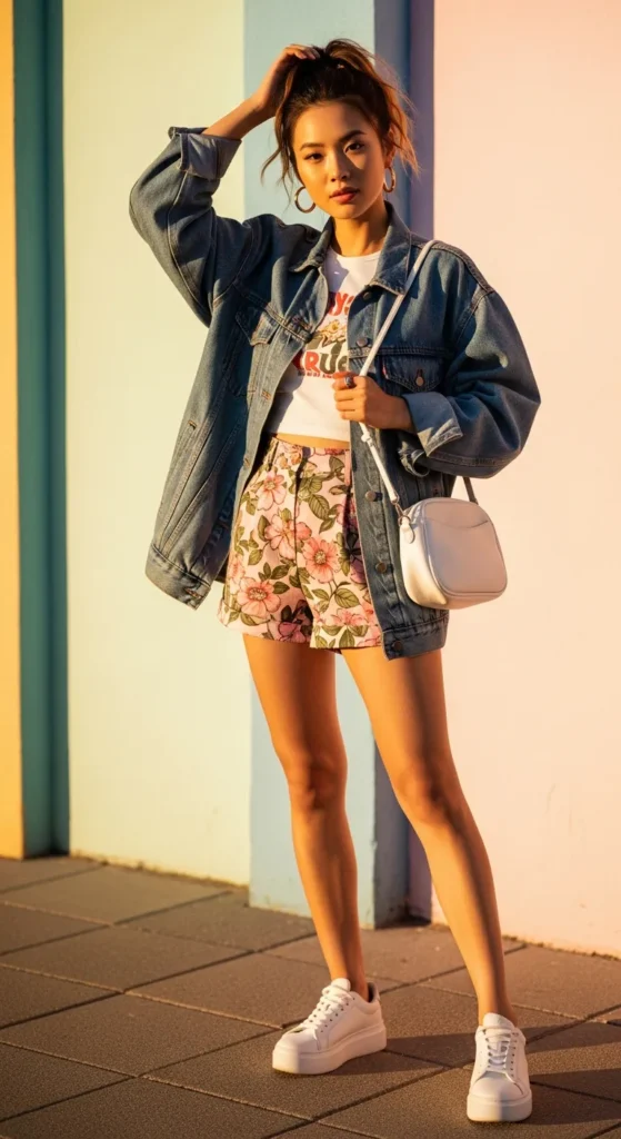 Tuck a fitted graphic tee into floral print shorts and layer a slightly oversized denim jacket on top. This combination feels summery and relaxed with just enough layering to make it look styled rather than simple.