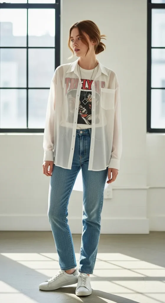 Layer a crisp, oversized sheer button-down shirt over your graphic tee, left completely unbuttoned. The sheer fabric lets the graphic print show through while giving the overall outfit an unexpected layered depth that reads as very intentional.