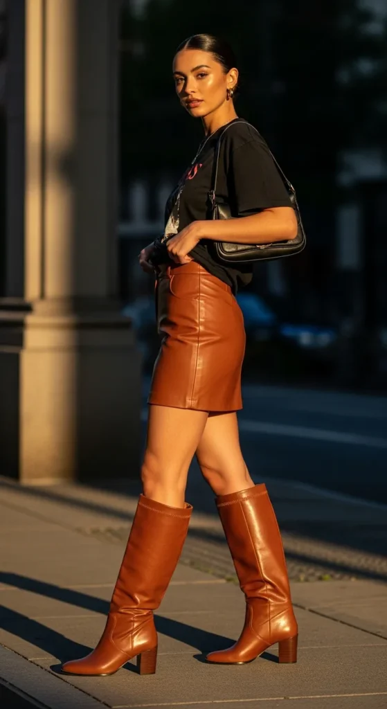Pair a relaxed graphic tee with a solid mini skirt and pull on knee-high boots in cognac or black. The boots do the heavy lifting here in terms of style, and the graphic tee keeps the whole thing feeling young and effortless rather than overdressed.