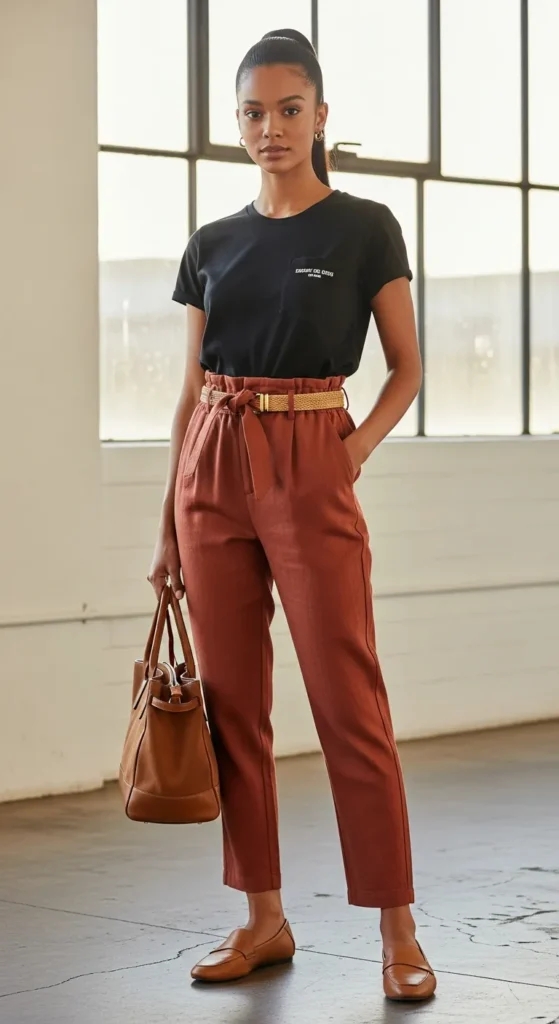 A paperbag waist trouser in terracotta, olive, or rust pairs with a simple graphic tee in a way that feels incredibly editorial. The gathered waist detail does all the styling work for you, so the tee just needs to show up and be itself.