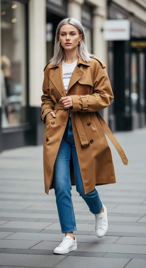 Throw a classic beige or camel trench coat over a graphic tee with straight-leg jeans and white sneakers. The trench coat immediately elevates the casualness of the tee into something that looks incredibly Parisian and effortlessly chic.