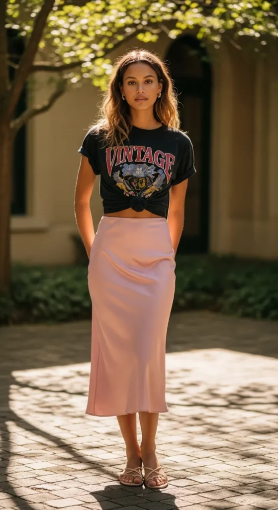 Take your graphic tee and knot it at the front, then layer it over a satin midi slip skirt in dusty rose or sage green. The mix of casual and delicate textures creates that effortless contrast that always photographs beautifully and feels genuinely wearable.