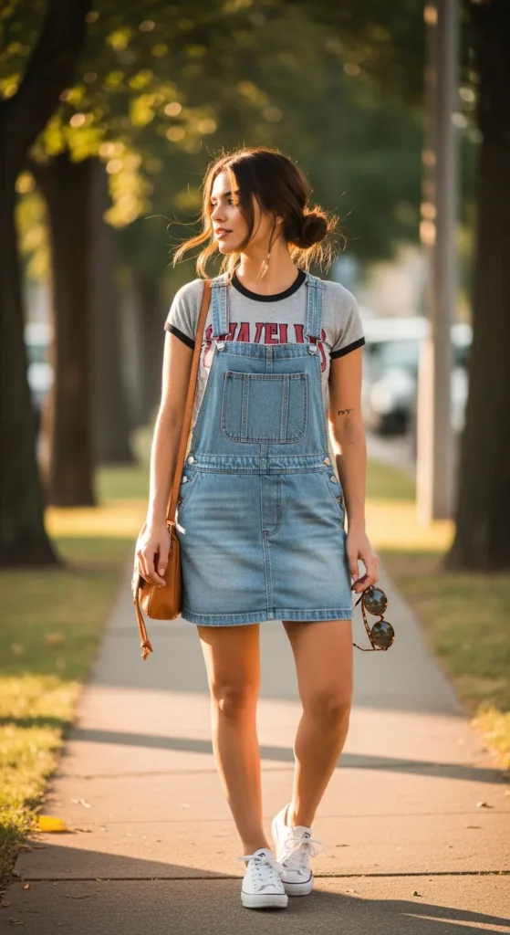Slip a fitted graphic tee underneath a denim or corduroy pinafore dress. Let the tee show at the neckline and sleeves. This layered approach gives the outfit dimension and a nostalgic charm that feels fresh rather than dated.