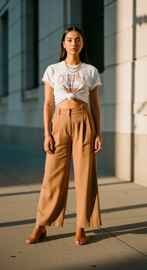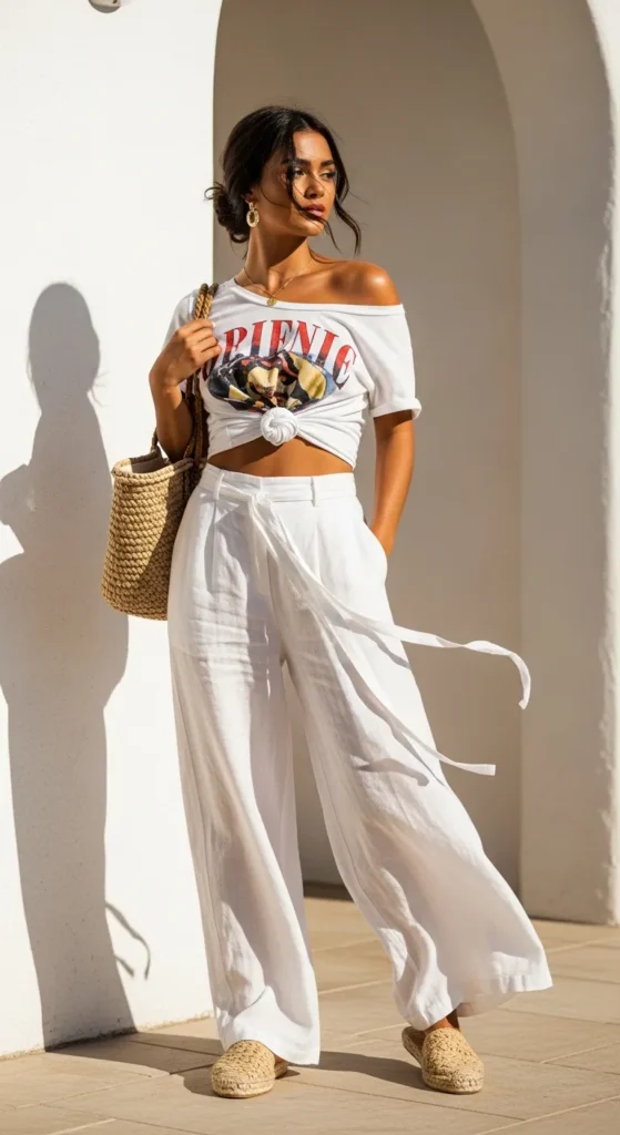 Knot a graphic tee at your hip and wear it over wide, flowy linen pants in white or warm oatmeal. This is the kind of outfit that works beautifully for outdoor brunches and casual hangouts where you want to look put-together without any effort.